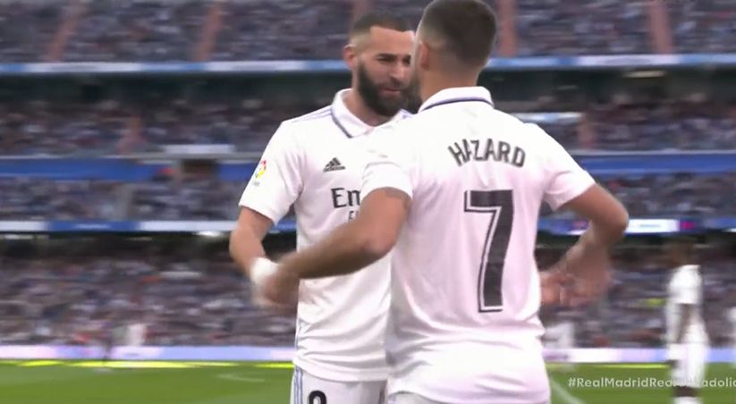 玩球网4月2日讯西甲第27轮,皇家马德里vs巴拉多利德。第64分钟,皇马换人,阿扎尔登场,换下戴帽的本泽马,阿扎尔上演个人2023年西甲首秀!