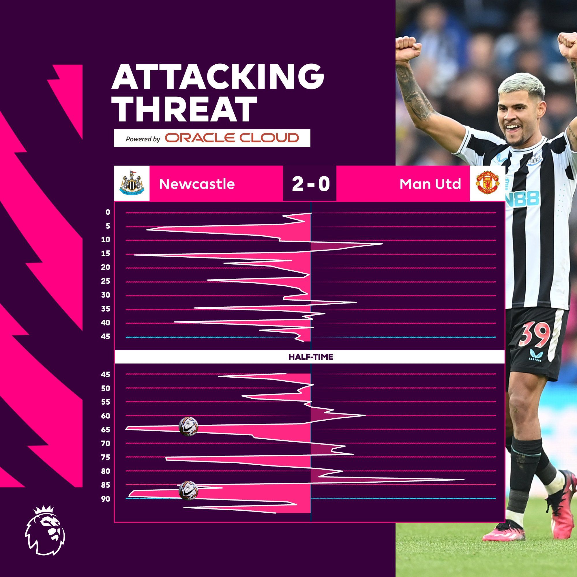 压着打!纽卡全场威胁进攻次数大幅压制曼联