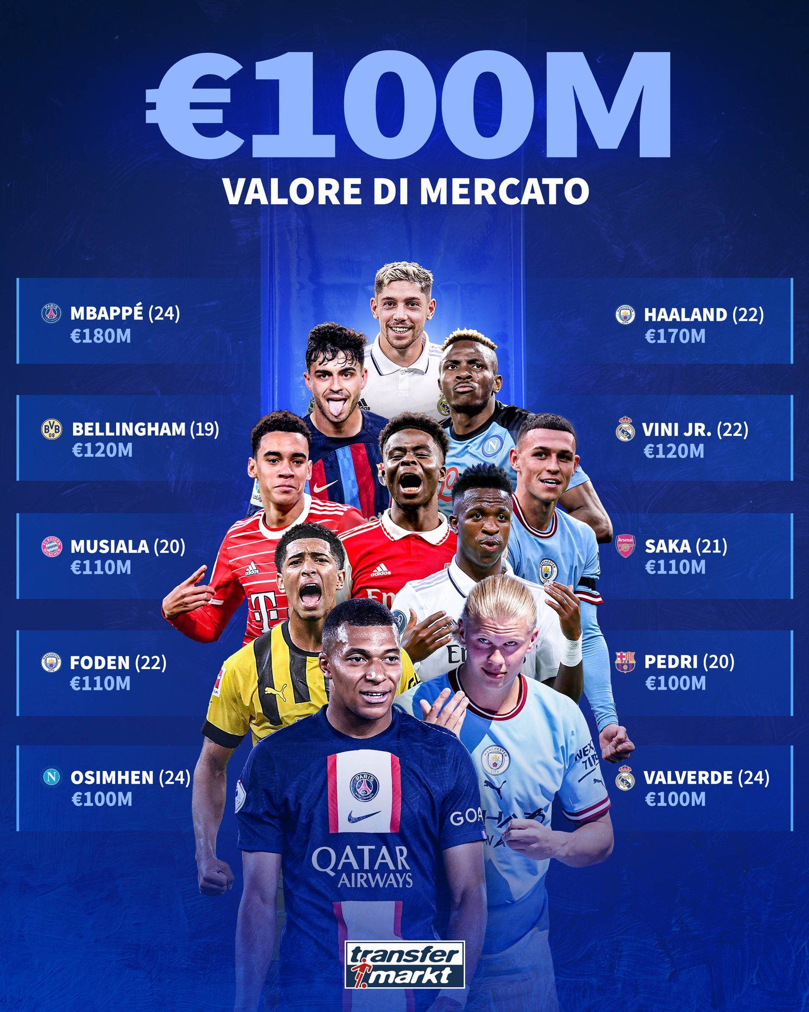 玩球网4月4日讯今日,德转发布了一张身价过亿球员汇总的海报。海报上身价过亿的球员有:姆巴佩(1.8亿)、哈兰德(1.7亿)、贝林厄姆(1.2亿)、维尼修斯(1.2亿)、穆西亚拉(1.1亿)、萨卡(1.