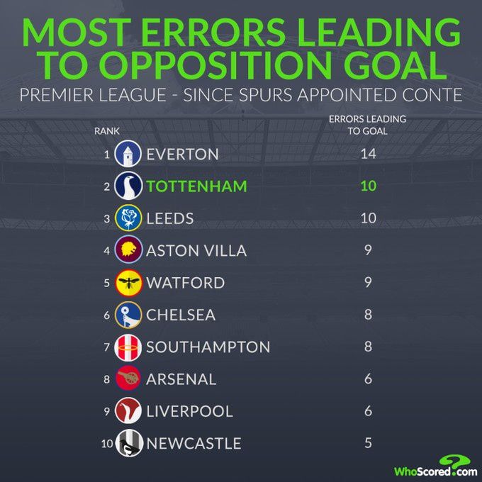 玩球网4月4日讯热刺在本轮英超被埃弗顿1-1绝平,whoscored数据统计显示他们本赛季已经7次因失误导致丢球,是各队之最。而如果自他们任命孔蒂为新帅时算起,至今在英超已有10次失误导致丢球,同期和