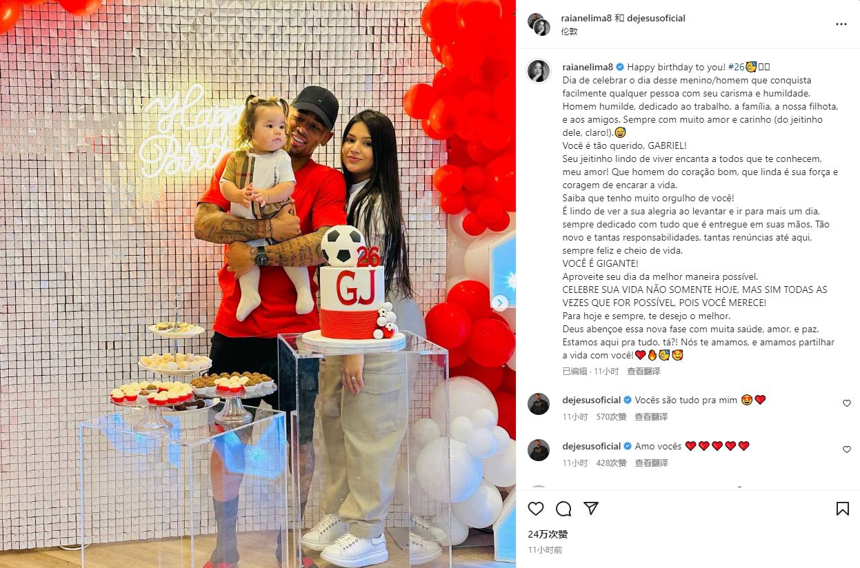 玩球网4月4日讯昨天是阿森纳前锋热苏斯的26岁生日,他的女友RaianeLima在Instagram发文和晒图,为他庆祝生日。RaianeLima写道:“祝你26岁生日快乐!这个男孩/男人用自己的魅力