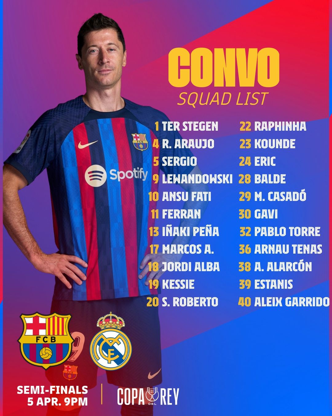 玩球网4月4日讯巴萨公布国王杯次回合战皇马大名单,莱万领衔,德容、佩德里、登贝莱伤缺。巴萨名单门将:1-特尔施特根、13-佩尼亚、36-特纳斯后卫:4-阿劳霍、17-阿隆索、18-阿尔巴、20-罗贝托