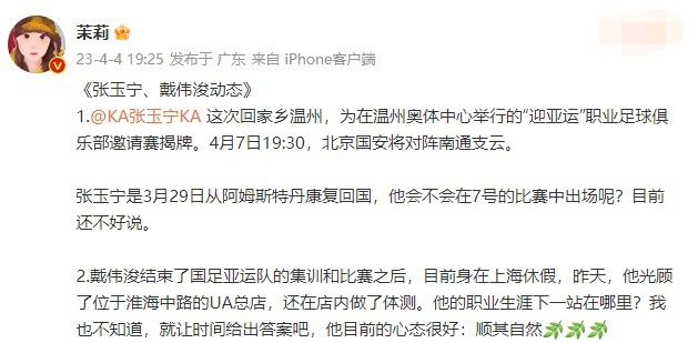 玩球网4月4日讯记者程文莉表示,3月底康复回国后的张玉宁回到家乡温州,为“迎亚运”俱乐部邀请赛揭牌。同时,结束了国足亚运队集训与比赛后的戴伟浚目前正在休假,职业生涯下一站在哪,暂时未明。张玉宁3月29