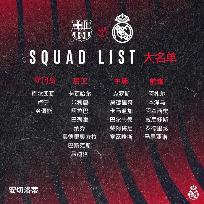 玩球网4月4日讯皇马公布国王杯次回合对阵巴萨名单,本泽马领衔,维尼修斯、莫德里奇等在列,费兰-门迪伤缺。门将:库尔图瓦、卢宁、路易斯-洛佩斯后卫:卡瓦哈尔、米利唐、阿拉巴、巴列霍、纳乔、奥德里奥索拉、