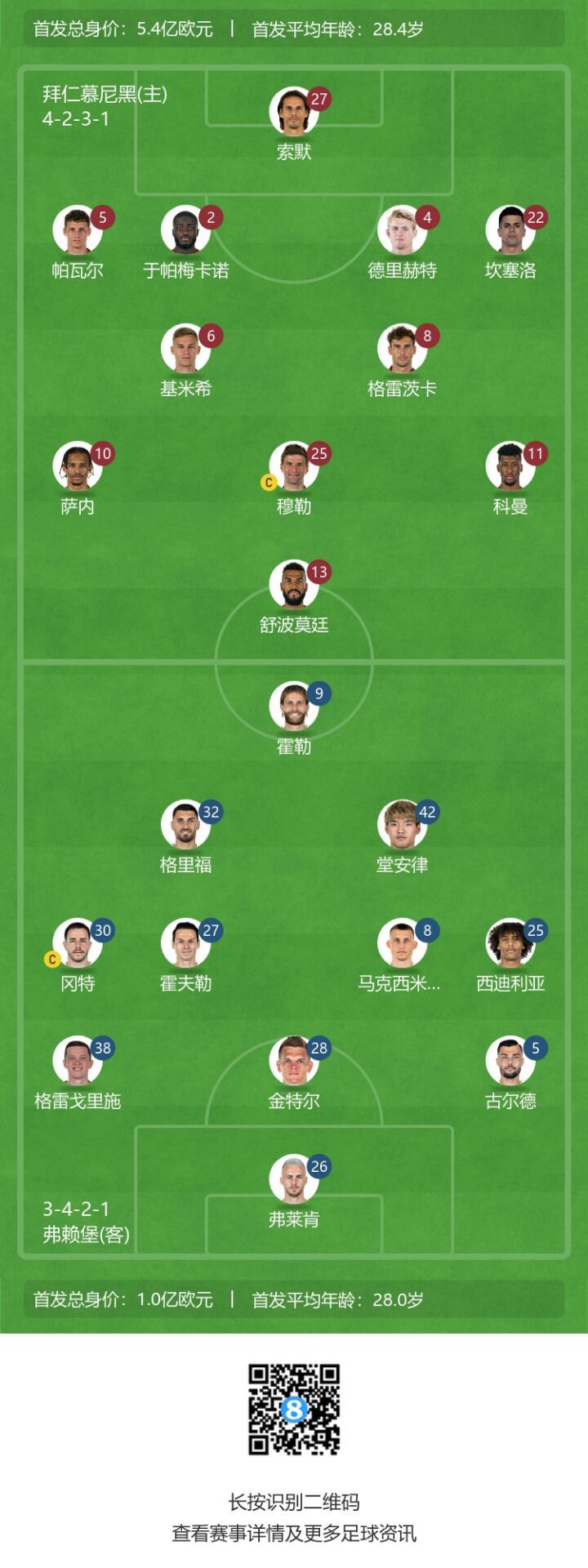 玩球网4月5日讯德国杯1/4决赛,拜仁主场对阵弗赖堡。赛前,官方公布首发名单。拜仁首发:27-索默、2-于帕梅卡诺、4-德里赫特、5-帕瓦尔、22-坎塞洛、6-基米希、8-格雷茨卡、10-萨内、11-