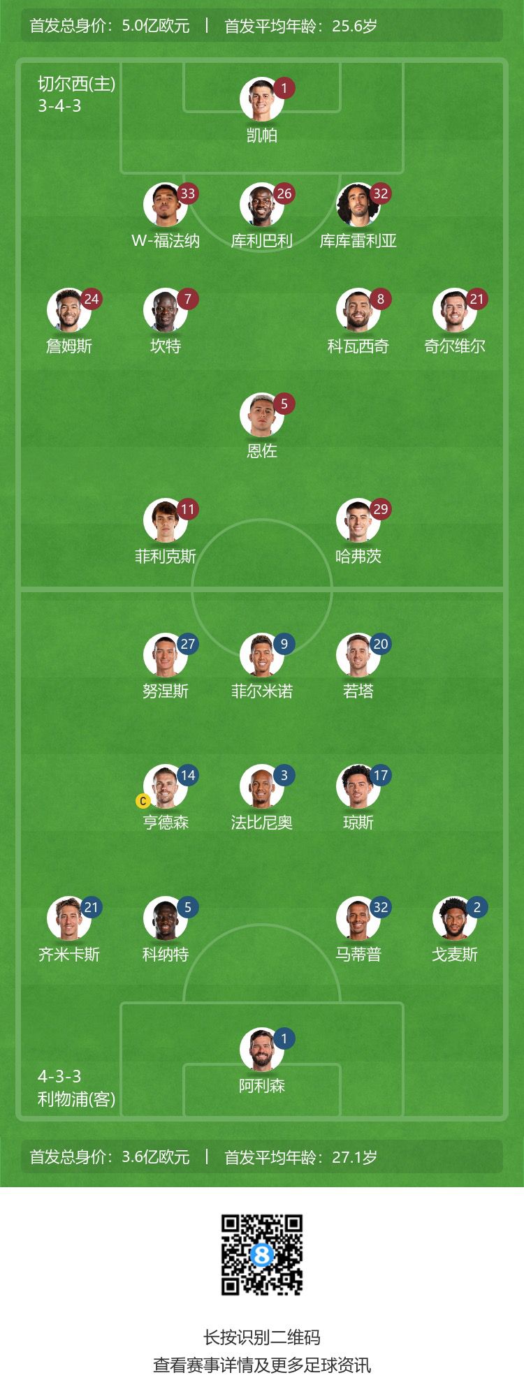 玩球网4月5日讯英超第八轮补赛,切尔西主场迎战利物浦比赛即将打响。赛前首发出炉。根据赛前消息,本场利物浦范迪克因病缺席。切尔西首发:1-凯帕、21-奇尔维尔、33-W-福法纳、32-库库雷利亚、26-