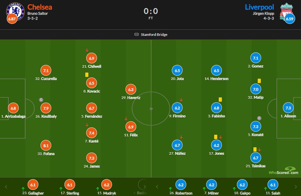 玩球网4月5日讯北京时间4月5日凌晨切尔西在主场迎来了利物浦的挑战,最终切尔西在主场与利物浦互交白卷,双方都没有进球。本场比赛福法纳表现出色,他也获得了全场最高的8.1分,以下是详细评分。 切尔西:凯帕6.8;库库雷利亚7.1;库利巴利7.9;福法纳8.1;奇尔维尔6.9;科瓦西奇6.5;恩佐6.7;坎特7.4;詹姆斯7.3;菲利克斯6.9;哈弗茨6.3;替补球员:加拉格尔6.1;斯特林6.1;穆德里克6.2; 利物浦:阿利森7.3;戈麦斯7.1;马蒂普7;科纳特7.3;奇米卡斯6.7;琼斯6.2;法比尼奥6.8;亨德森6.5;若塔6.;菲尔米诺6.2;努涅斯6.7;替补球员:罗伯逊6.2;米尔纳6.2;加克波6.2;萨拉赫6.1 |