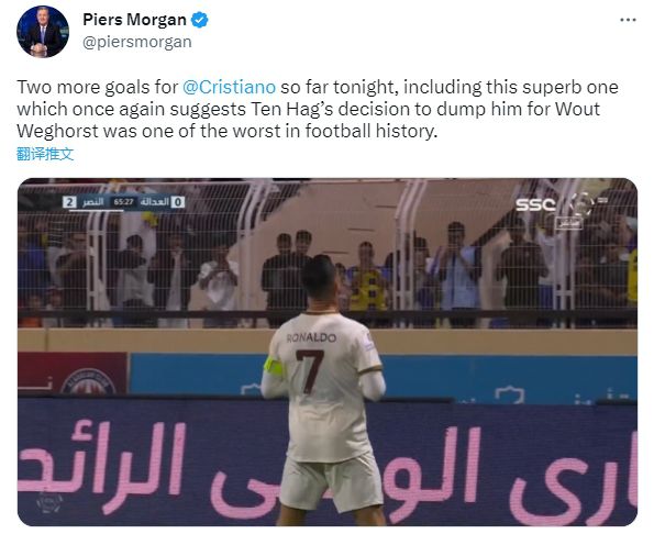 玩球网4月5日讯沙特联第22轮,利雅得胜利5-0大胜哈萨正义,C罗在本场比赛梅开二度。在C罗打进第二球后,摩根发推:“C罗今晚到目前为止又进了两个球,包括这个精彩的进球,这再次证明滕哈赫为了韦霍斯特抛