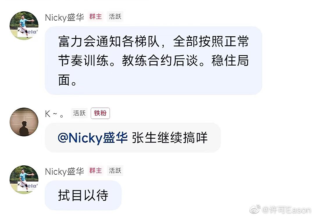 玩球网4月5日讯据媒体人许可消息,富力集团还想继续经营球队,会通知各梯队按正常节奏训练。许可今天在社媒发布了一张聊天截图,并配文:“富力还想继续蹦跶”,聊天截图中显示:“富力会通知各梯队,全部按照正常