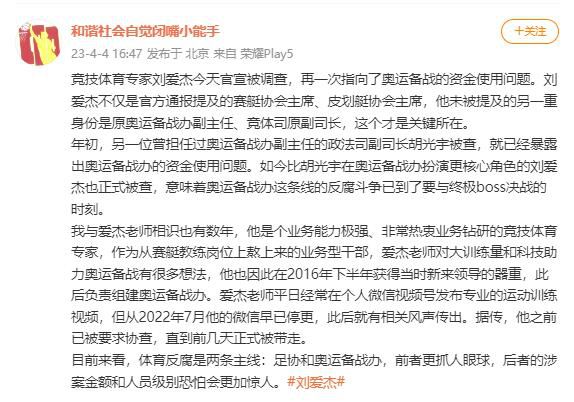 玩球网4月5日讯昨日,体育总局纪委监察组宣布,中国赛艇协会、中国皮划艇协会原主席刘爱杰被查。 资深媒体人付政浩谈到了当前体坛反腐的情况:“此前曾担任奥运备战办副主任的政法司副司长胡光宇被查,就已经暴露出奥运备战办的资金使用问题。如今比胡光宇在奥运备战办扮演更核心角色的刘爱杰也正式被查,意味着奥运备战办这条线的反腐斗争已到了要与终极boss决战的时刻。” “目前来看,体育反腐是两条主线:足协和奥运备战办,前者更抓人眼球,后者的涉案金额和人员级别恐怕会更加惊人。” 付政浩还透露:奥运备战资金很可能早已被大量透支,已经影响到了巴黎奥运会的备战工作。 |