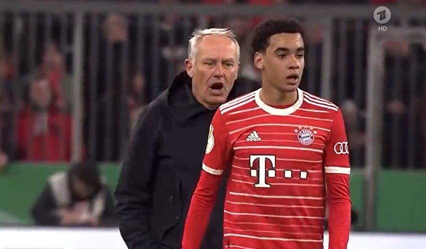 玩球网4月5日讯德国杯四分之一决赛,拜仁1-2遭弗莱堡淘汰。本场比赛补时阶段,穆西亚拉不幸手球送点,导致拜仁被绝杀出局。输球后的穆西亚拉显得心情不太好,当弗莱堡主帅施特赖希主动前来和穆西亚拉打招呼时,