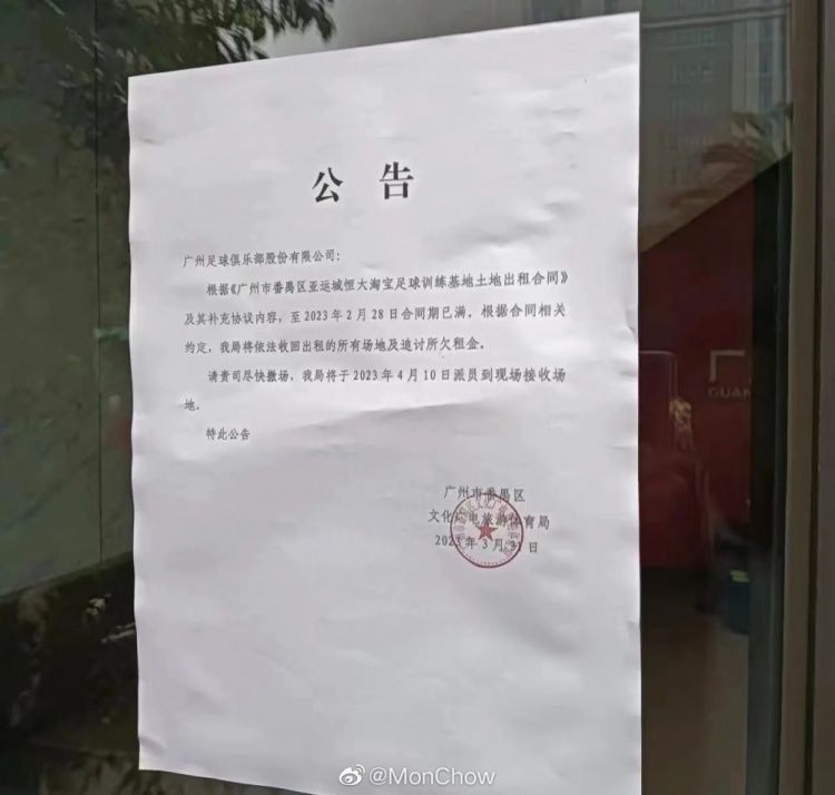玩球网4月5日讯据媒体人周剑文报道,广州队租用的场地将遭到回收,周剑文在社媒晒出了广州市番禺区文化广电旅游体育局发出的公告,根据《广州市番禺区亚运城恒大淘宝足球训练基地土地出租合同》及其补充协议内容,