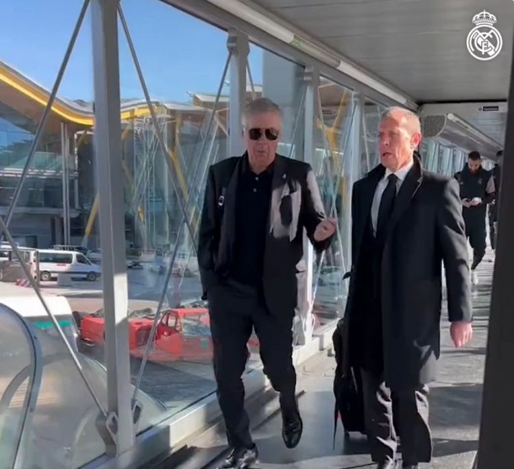 皇马官方账号在社交媒体上晒出球队启程前往巴塞罗那的视频,安切洛蒂戴着一副墨镜,帅气地带领球员们出征。