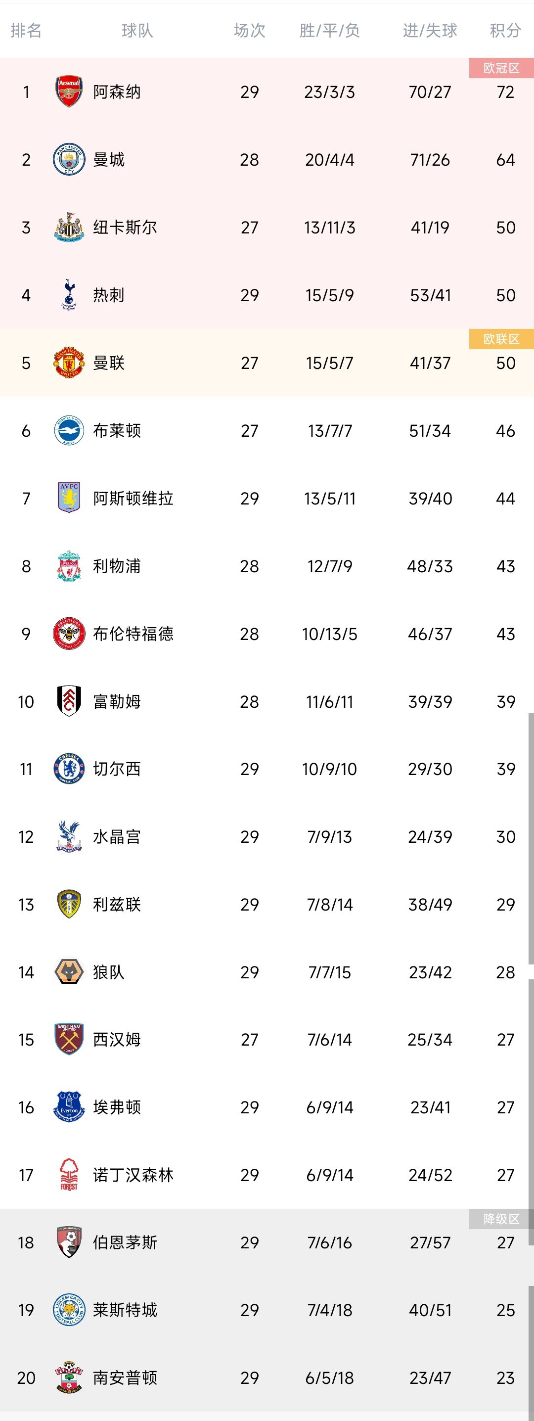 英超第8轮补赛,切尔西0-0战平利物浦,算上这场比赛,两支球队已经连续六场比赛战成平局。当前的欧冠区欧联区均需要50分才能参赛,各大球队此后肯定也会为了欧战名额全力以赴。 利物浦目前排在英超第8仅积43分,切尔西则是积39分排在英超第11。面对纽卡、热刺、曼联、布莱顿、维拉等球队的重重绞杀,甚至是降级区球队的拼死狙击,下赛季欧战红蓝军会去哪儿踢球呢? 英超积分榜↓ |