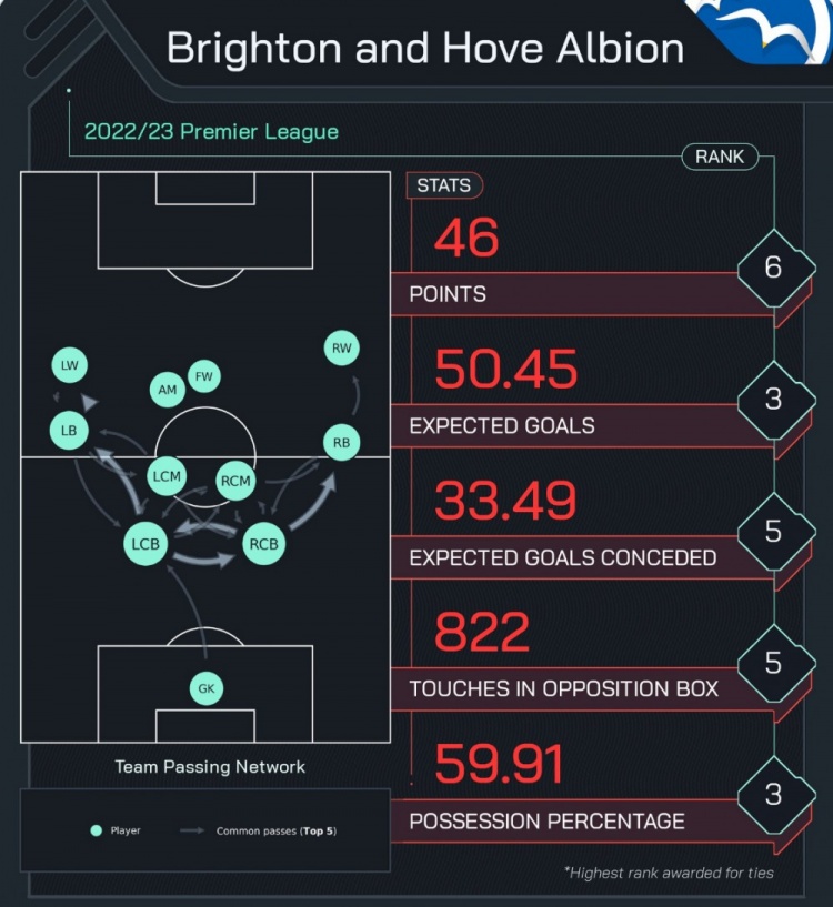 玩球网4月5日讯在英超第7轮补赛中,布莱顿客场2比0击败伯恩茅斯,目前积46分排名英超第6位,Squawka统计了布莱顿本赛季在英超的部分数据。布莱顿本赛季英超部分数据:积分——46(英超第6)预期进