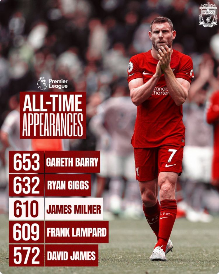 玩球网4月5日讯在北京时间今天凌晨进行的英超第8轮补赛中,米尔纳替补出场,最终利物浦客场0比0战平切尔西。利物浦官方社媒指出,米尔纳在英超出场610次,历史出场榜中排名第三。英超历史出场榜:加雷斯-巴
