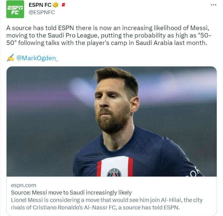 玩球网4月5日讯ESPN报道,梅西正在积极考虑去沙特职业联赛踢球,他加盟利雅得新月的可能性越来越大。ESPN昨天消息称,梅西已不可能与巴黎圣日耳曼续约,今夏将成为自由身。2022年底,利雅得新月就曾与