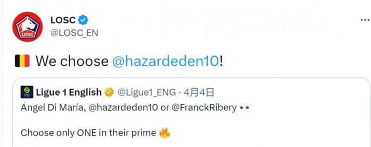 玩球网4月5日讯里尔俱乐部官方推特表示,在处于巅峰期的迪马利亚、阿扎尔和里贝里之中,他们会选择阿扎尔。法甲官方在推特上晒出迪马利亚、阿扎尔和里贝里的照片,询问球迷们会选择巅峰期的哪名球员,里尔俱乐部官