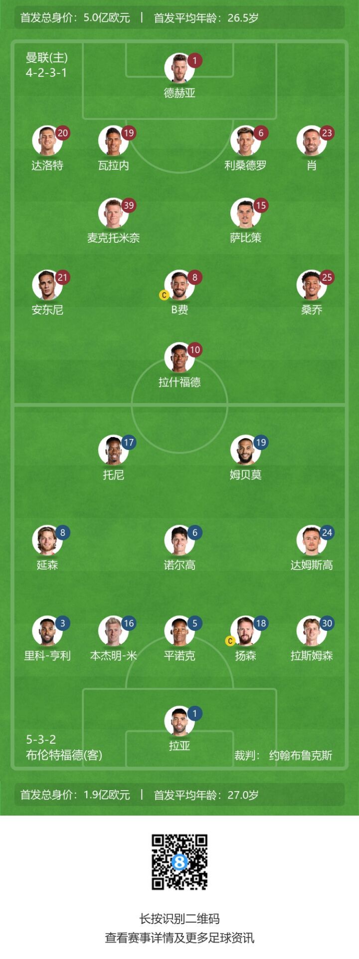 玩球网4月6日讯英超第25轮补赛,曼联主场对阵布伦特福德。赛前,官方公布首发名单。曼联首发:1-德赫亚、20-达洛特、19-瓦拉内、6-利桑德罗-马丁内斯、23-卢克-肖、15-萨比策、39-麦克托米