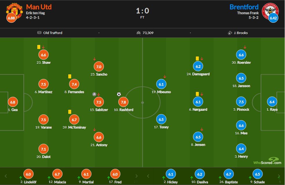 玩球网4月6日讯在刚刚结束的一场英超第25轮补赛中,曼联凭借着拉什福德的进球1-0小胜布伦特福德。在whoscored的赛后评分里,此役破门的拉什福德获得7.8分,为全场最高评分。评分如下↓曼联:德赫