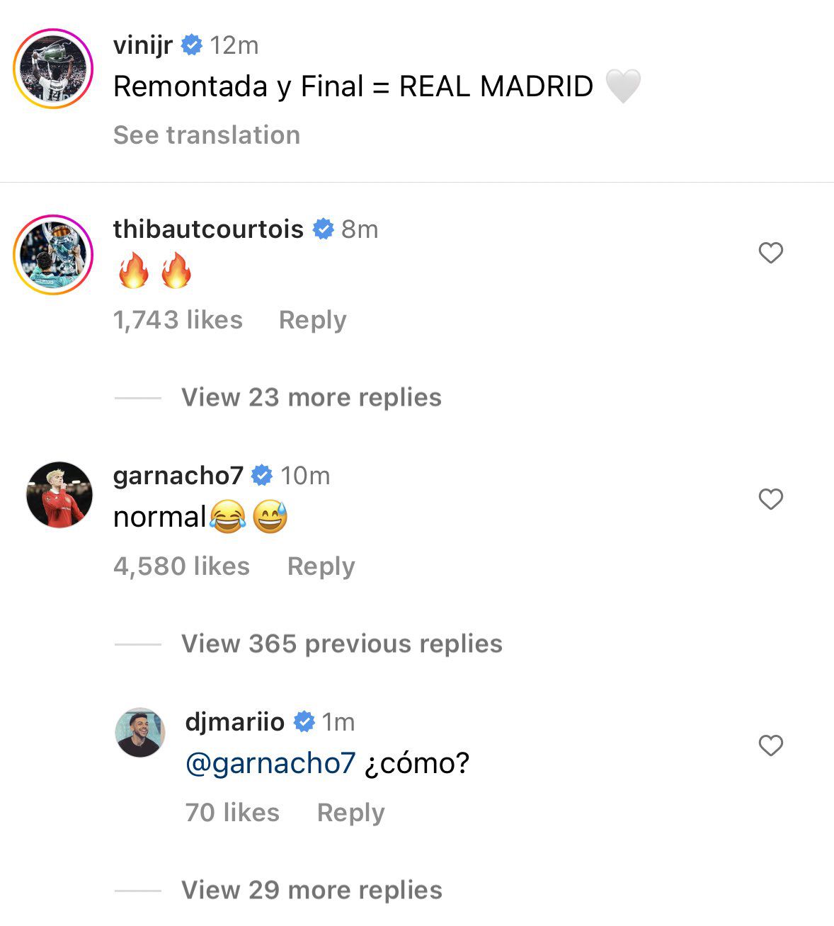赛后,维尼修斯发文庆祝晋级决赛,加纳乔点赞评论:“正常???? ????。”