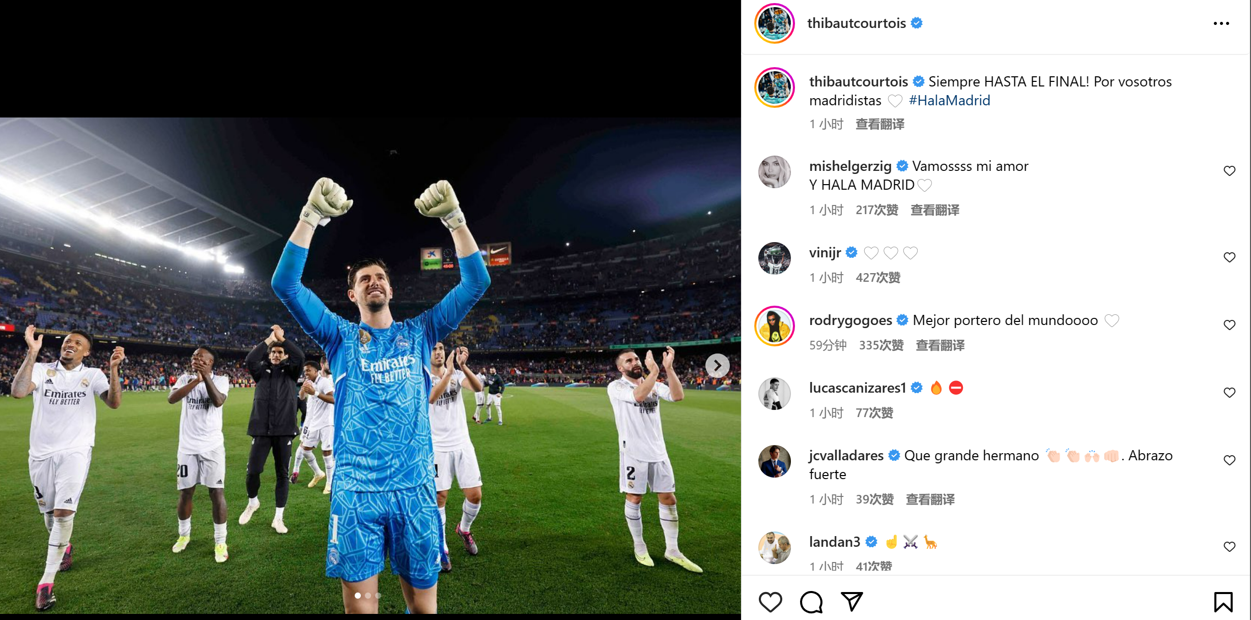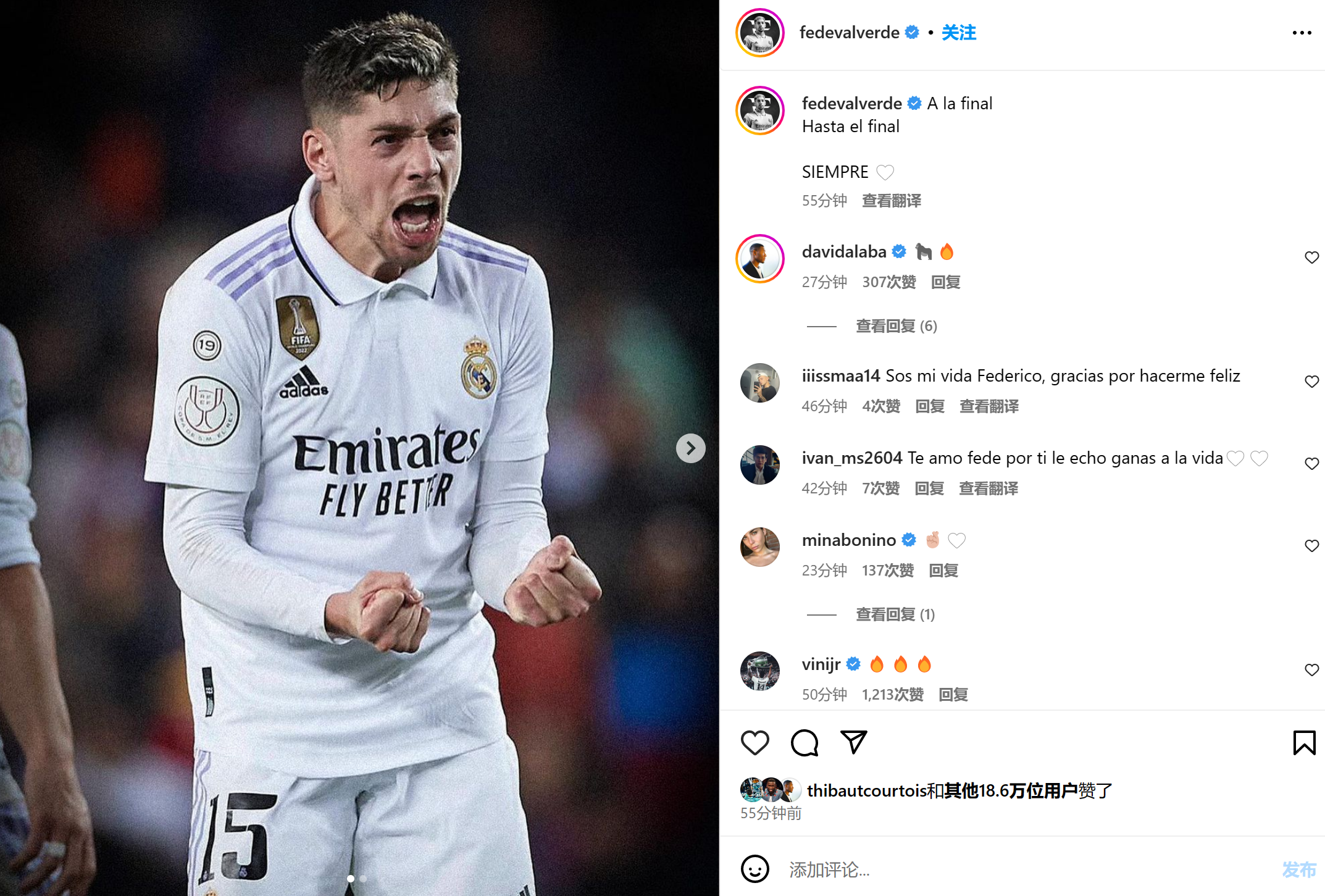 玩球网4月6日讯 在西班牙国王杯半决赛次回合,皇马4-0完胜巴萨,总比分4-1晋级决赛。 赛后皇马多将都在个人社媒晒照庆祝球队晋级,本泽马配文写道:“白衣军团!” 罗德里戈则晒出手持皇马生涯150场纪念球衣照片,写道:“又达成一项里程碑,感情始终如一。在最伟大俱乐部达成150场,我爱皇马!” 巴尔韦德则配文庆祝道:“杀入决赛,直到最后!” 库尔图瓦社媒晒照配文:“打进最后的决赛,献给所有皇马球迷!” (陈皮不是橙) |