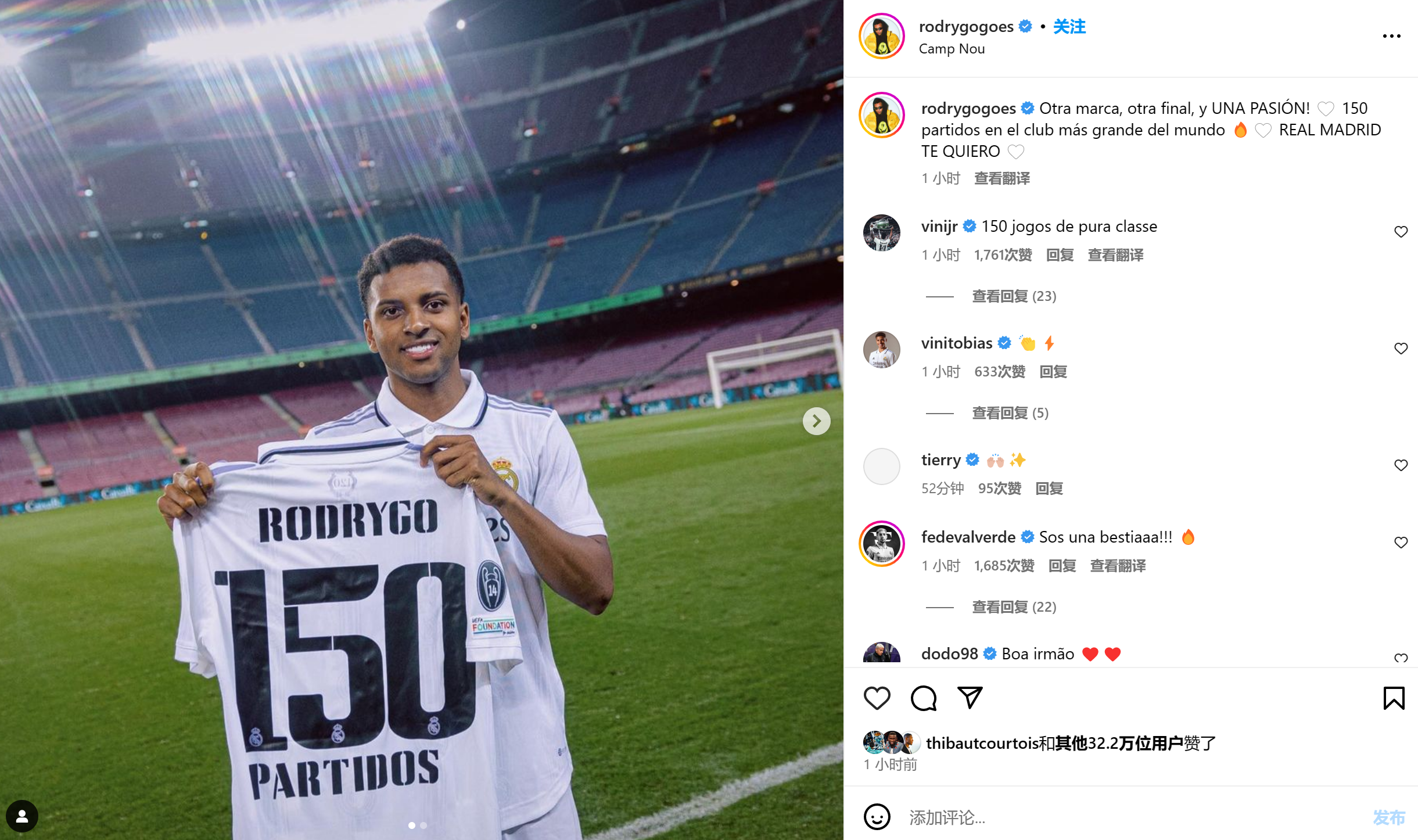 玩球网4月6日讯在西班牙国王杯半决赛次回合,皇马4-0完胜巴萨,总比分4-1晋级决赛。赛后皇马多将都在个人社媒晒照庆祝球队晋级,本泽马配文写道:“白衣军团!”罗德里戈则晒出手持皇马生涯150场纪念球衣