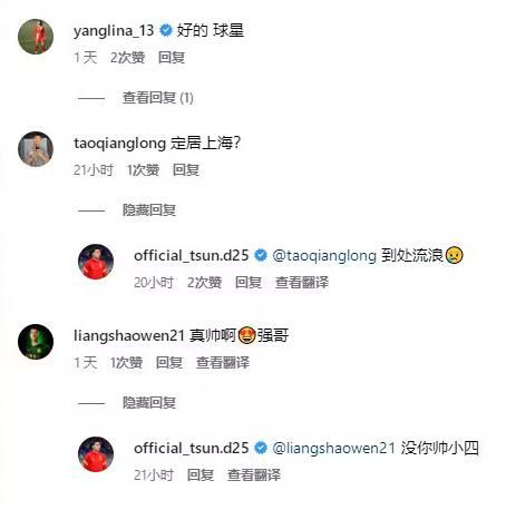 玩球网4月6日讯最近,正在上海度假的戴伟浚更新了个人社媒,不少球员也询问起他是否要加盟申花。 戴伟浚在社媒晒出了他在上海的照片并配文:“就是这样…做你认为对的事就好。” 这条社媒也引发了很多球员的关注。中国女足球员杨莉娜在评论里写道:“好的,球星。”戴伟浚则回复:“你才是。” 陶强龙询问戴伟浚,是否“定居上海”?对此,戴伟浚则调侃表示:“到处流浪。” 梁少文夸奖称:“真帅啊,强哥。”戴伟浚回复道:“没你帅,小四。” (德里森) |