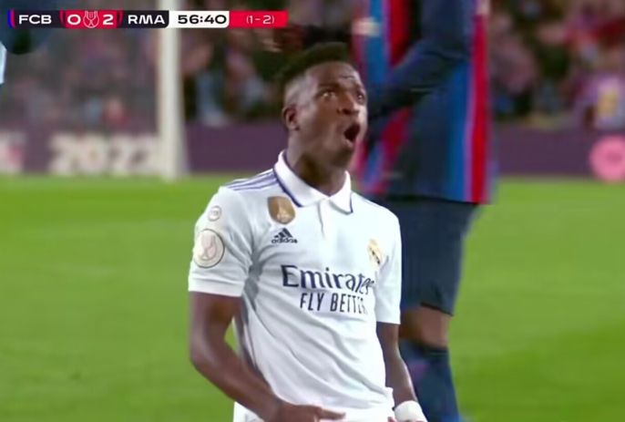 玩球网4月6日讯国王杯半决赛次回合,皇马4-0大胜巴萨。比赛第57分钟,维尼修斯被凯西放倒,主裁判吹罚点球!维尼修斯仰天长啸!随后,本泽马点射破门完成双响!
