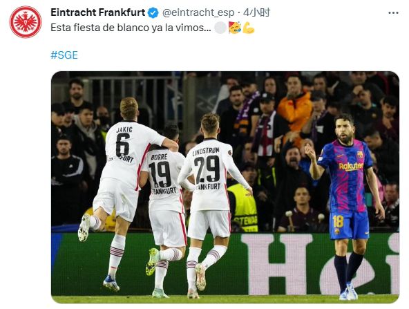 玩球网4月6日讯国王杯半决赛皇马总比分4-1战胜巴萨进决赛。赛后,法兰克福西班牙官推晒出上赛季对阵巴萨的照片,调侃:我们已经看到这个派对是白色的了。上赛季欧联杯1/4决赛次回合,法兰克福3-2战胜巴萨