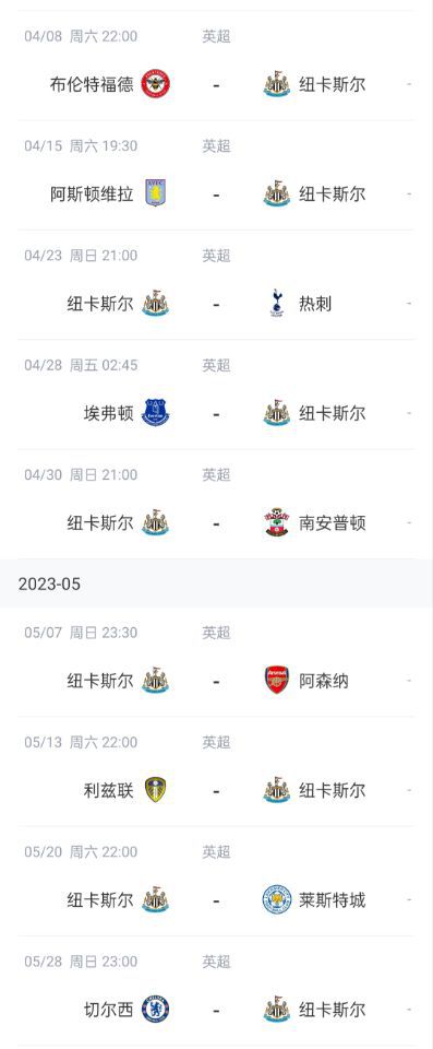 纽卡剩余赛程↓