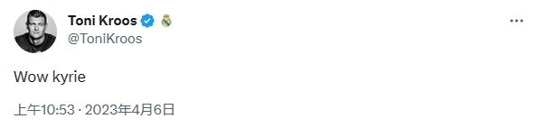 玩球网4月6日讯NBA常规赛,独行侠123-119战胜国王。欧文23中12拿下31分,末节独得19分。赛后,皇马球星克罗斯发推称赞欧文表现:Wowkyrie值得一提的是,北京时间今天凌晨,皇马4-0战