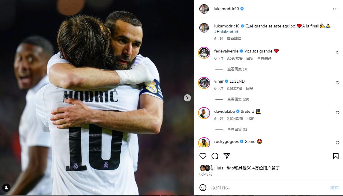 玩球网4月6日讯皇马在今天凌晨的国王杯半决赛次回合4-0击败巴萨晋级决赛,赛后本场先发登场的莫德里奇发文庆祝胜利。莫德里奇晒出与本泽马的相拥照:这支球队多么出色啊!进决赛啦!巴尔韦德评论:你如此伟大!