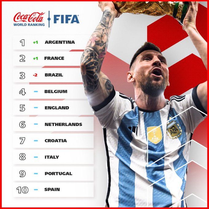 玩球网4月6日讯国际足联更新了新一期的国家队排名。阿根廷升至第一,法国、巴西分列二三。 世界前二十: 1-阿根廷 2-法国 3-巴西 4-比利时 5-英格兰 6-荷兰 7-克罗地亚 8-意大利 9-葡萄牙 10-西班牙 11-摩洛哥 12-瑞士 13-美国 14-德国 15-墨西哥 16-乌拉圭 17-哥伦比亚 18-塞内加尔 19-丹麦 20-日本 ———— 阿根廷上一次排名世界第一还是在2016年4月至2017年3月。 |