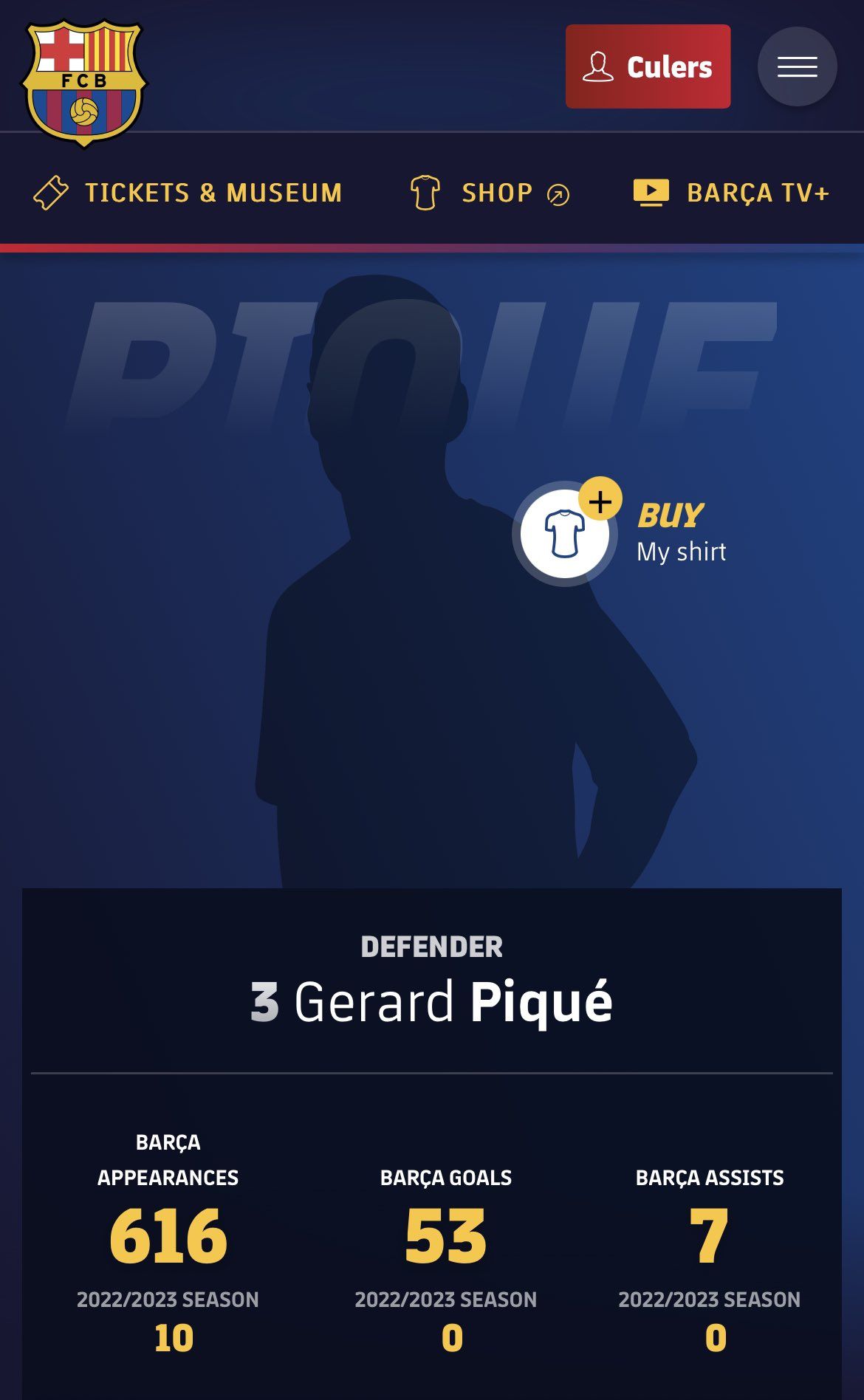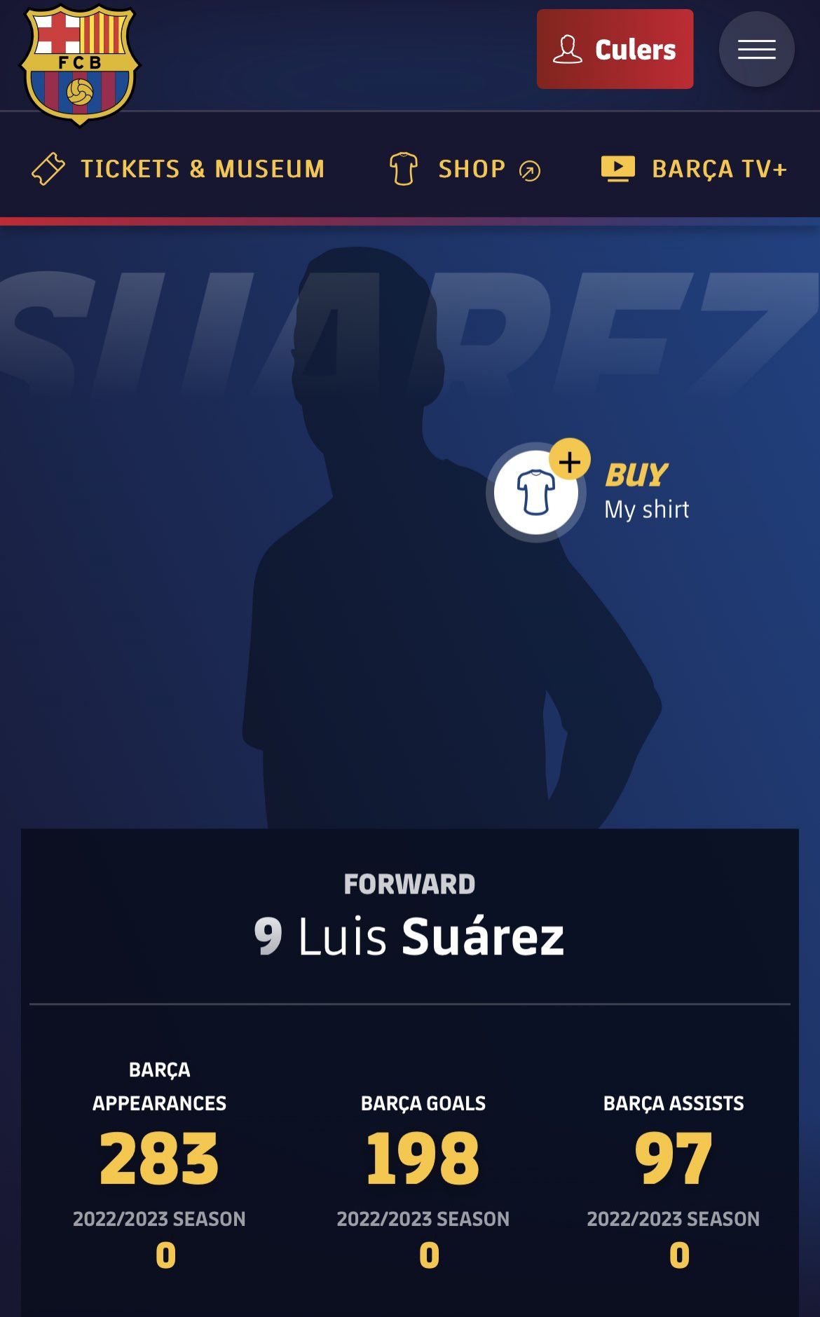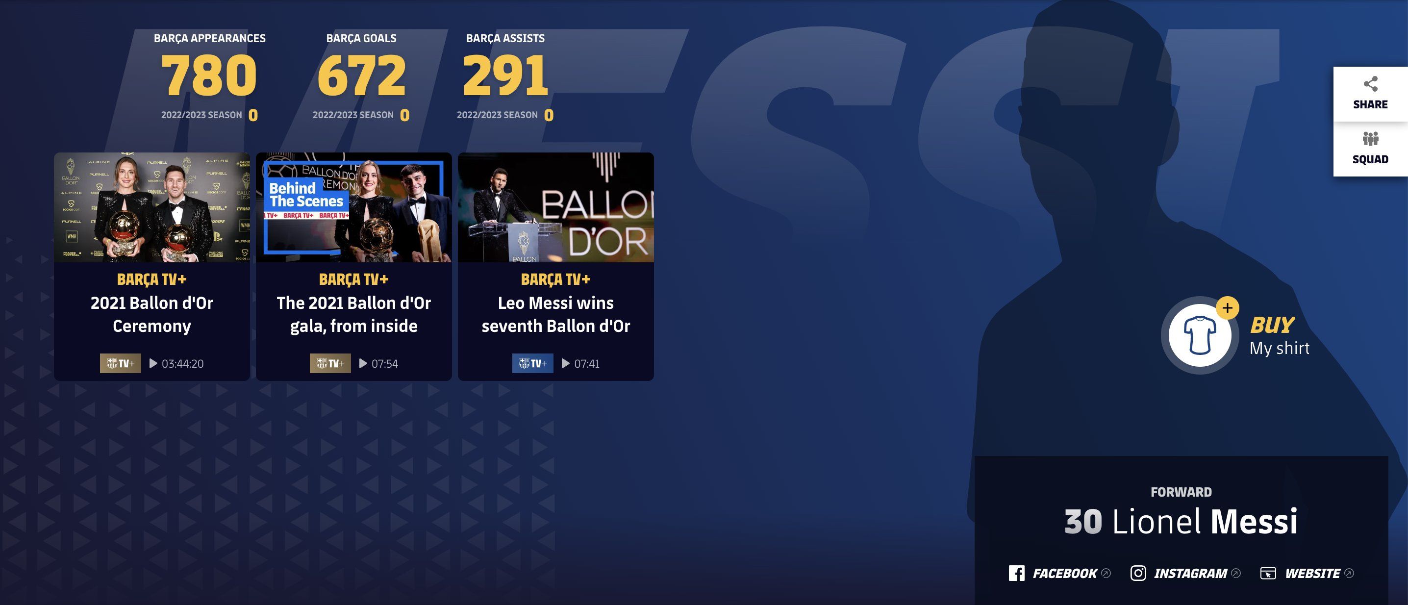 玩球网4月6日讯今天,有不少巴萨球迷发现巴萨官网上出现了几名前球员的介绍页面,其中还包含了梅西。梅西的介绍页面中人物图像显然是梅西的剪影,但球衣号码却是30号。页面中还写有梅西曾经在巴萨的出场数据,包