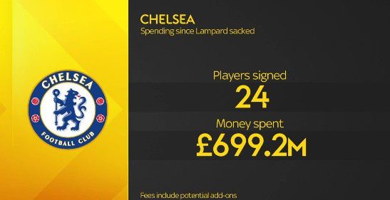 玩球网4月6日讯切尔西今日官宣兰帕德回归球队担任主帅,天空体育统计了蓝军在上一次解雇兰帕德之后所花费的引援费用和签约球员人数。据统计,在兰帕德离队之后,切尔西已经在转会市场中花费了6.992亿英镑(这