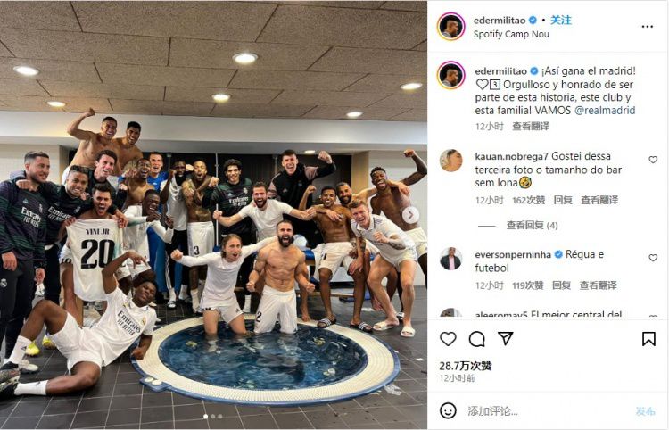 玩球网4月6日讯今天凌晨,皇马在国王杯中逆转淘汰巴萨,赛后米利唐在Instagram晒出全队合照庆祝,维尼修斯在评论区称赞了同胞。米利唐写道:“这就是皇马赢球的方式!能够成为这个故事、这支俱乐部和这个
