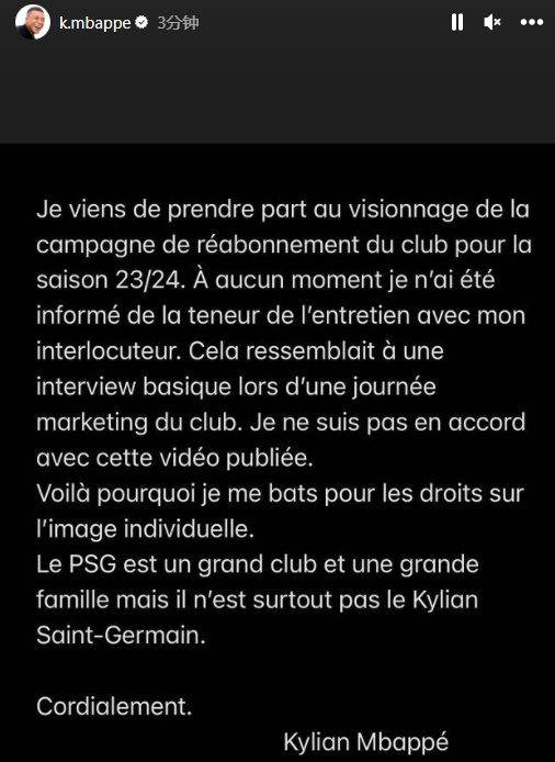 玩球网4月6日讯今天,巴黎圣日耳曼公布了一个会员续订视频,但阵中大将姆巴佩称并不清楚自己的采访内容会被用于公布的视频中,而俱乐部则未经自己同意公布了视频。后续:姆巴佩抗议生效????巴黎官方已经删除未经他许