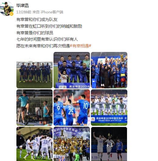 玩球网4月7日讯今天,毕津浩在个人社媒发文,向老东家申花队告别。现年32岁的毕津浩,自2016年以来已经在申花效力了7个赛季。目前,他已经确认转会加盟长春亚泰。毕津浩在社媒晒出多张效力申花期间的照片并