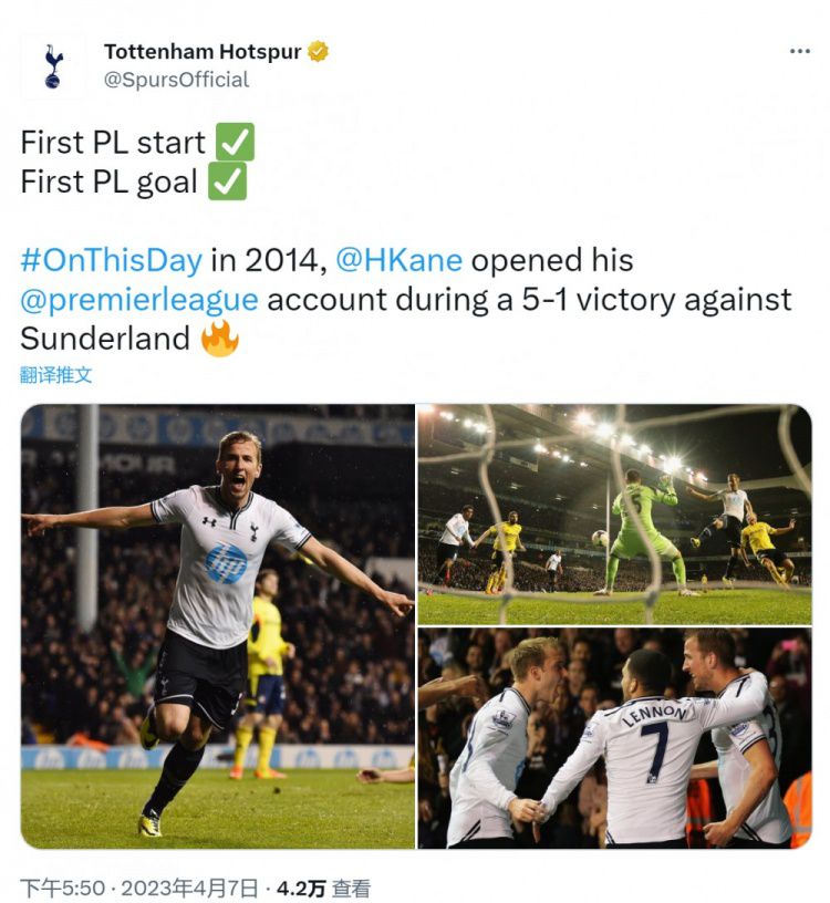 玩球网4月7日讯2014年的今天凯恩收获英超处子球,热刺官方社媒晒照回顾这值得纪念的时刻。2014年4月7日,凯恩首次在英超为热刺先发出战,并斩获了自己在英超的首粒进球,帮助热刺5比1大胜桑德兰。职业