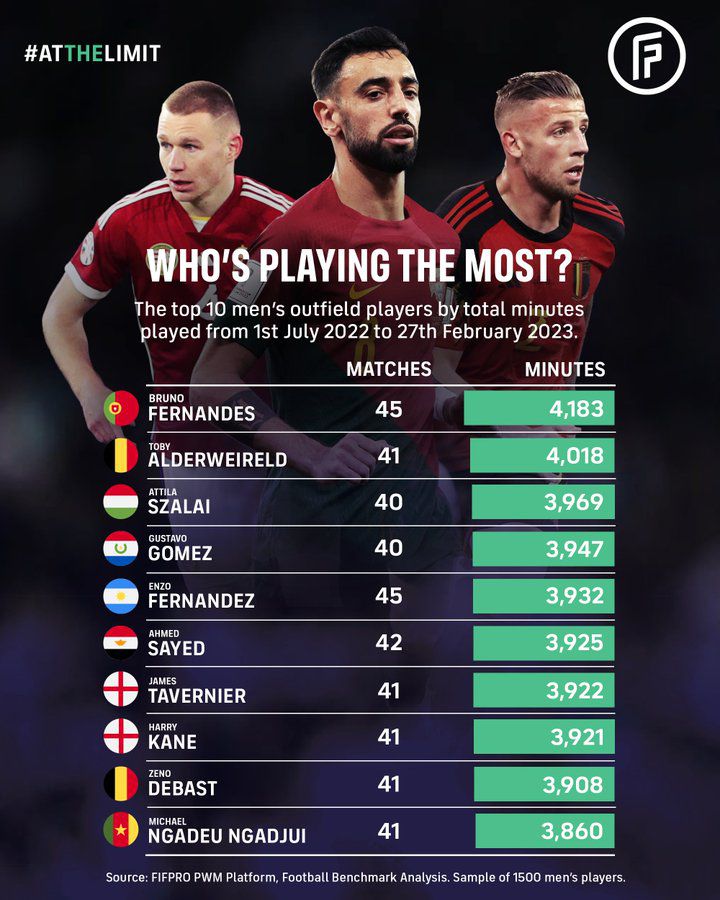 据FIFAPro针对1500多位男子足球运动员的统计,从去年7月1日到今年2月27日,曼联球员B费共出战45场比赛,上场时间4183分钟排在统计中所有男子球员首位。在前十中,凯恩、恩佐等名将在列。男子
