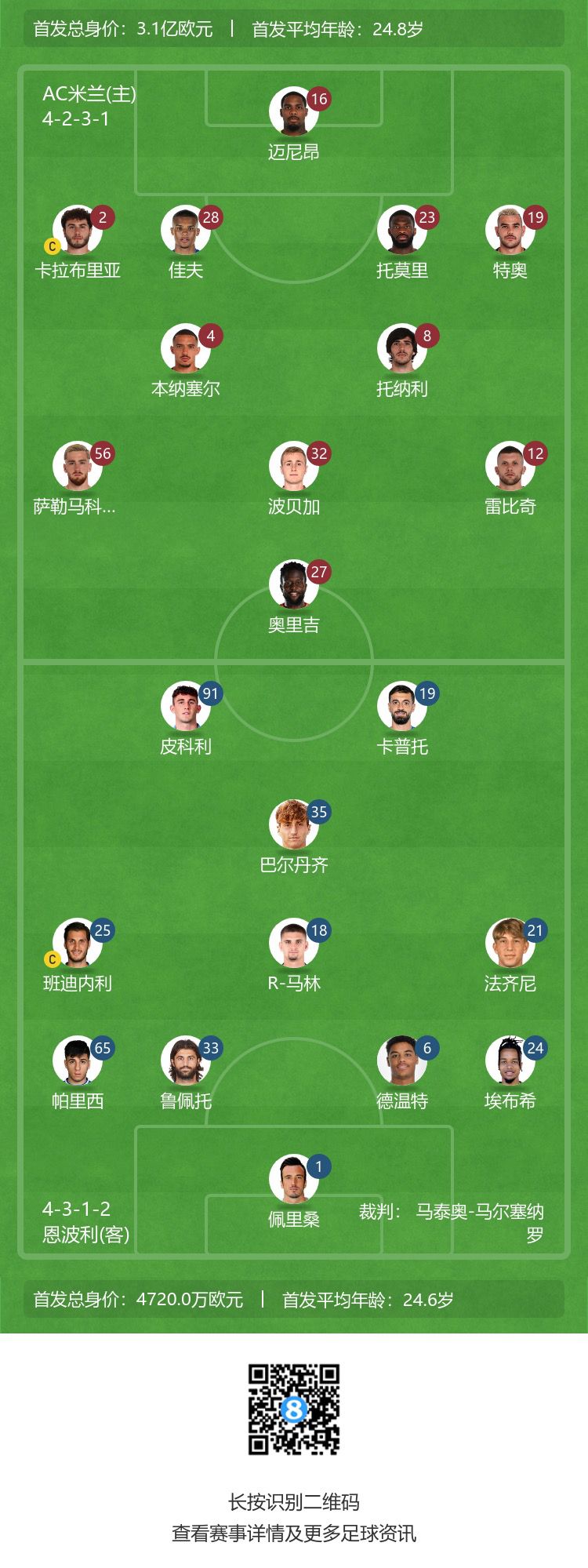 玩球网4月8日讯意甲第29轮,AC米兰主场迎战恩波利比赛即将打响。赛前首发出炉。AC米兰首发:16-迈尼昂、19-特奥、23-托莫里、28-佳夫、2-卡拉布里亚、8-托纳利、4-本纳塞尔、32-波贝加