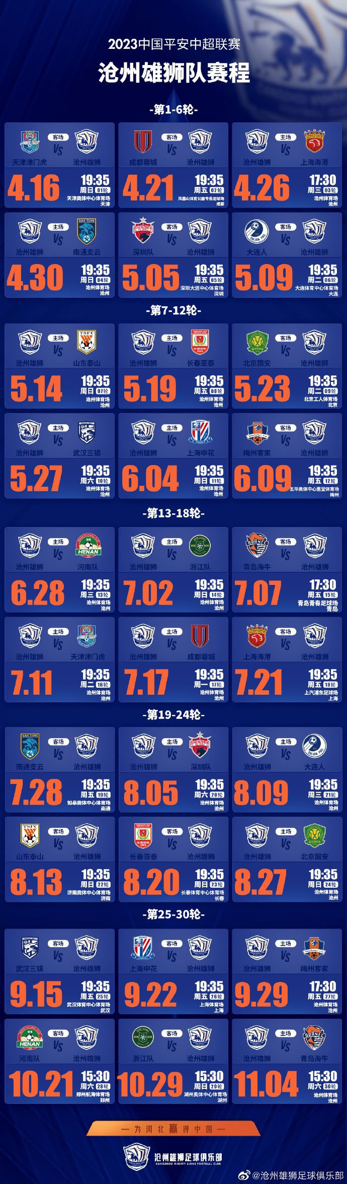 沧州雄狮2023赛季中超联赛赛程图奉上,期待与大家球场相见