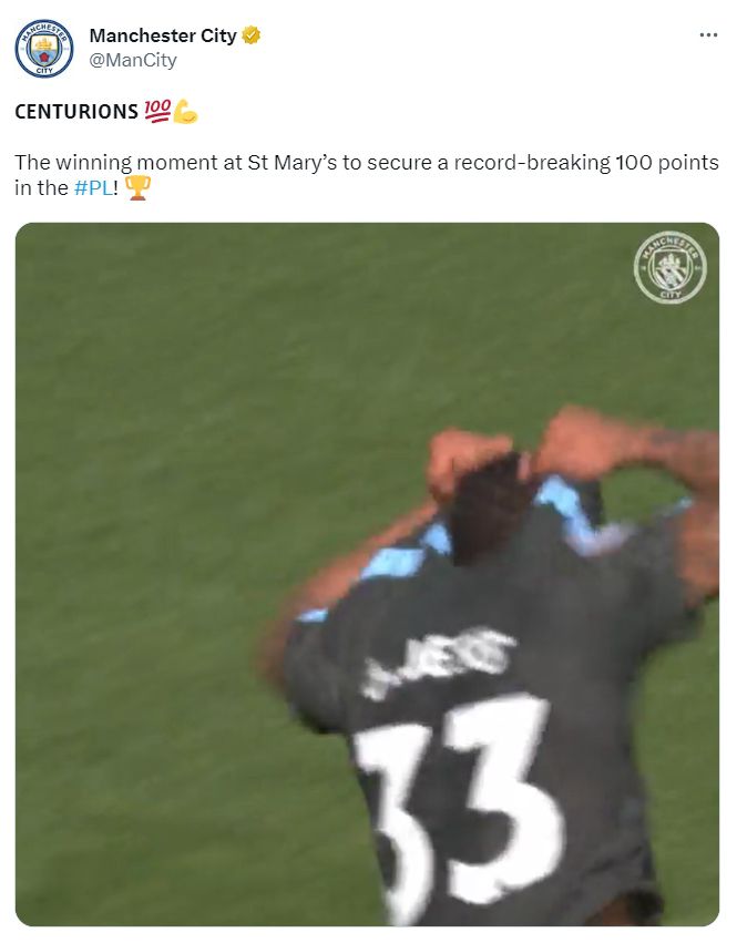 玩球网4月7日讯曼城官推今日回顾了俱乐部在2017/18赛季达成英超联赛100分的里程碑时刻。2018年5月13日,英超收官战,曼城客场对阵南安普顿。第93分钟,德布劳内后场长传,热苏斯高速插上禁区内
