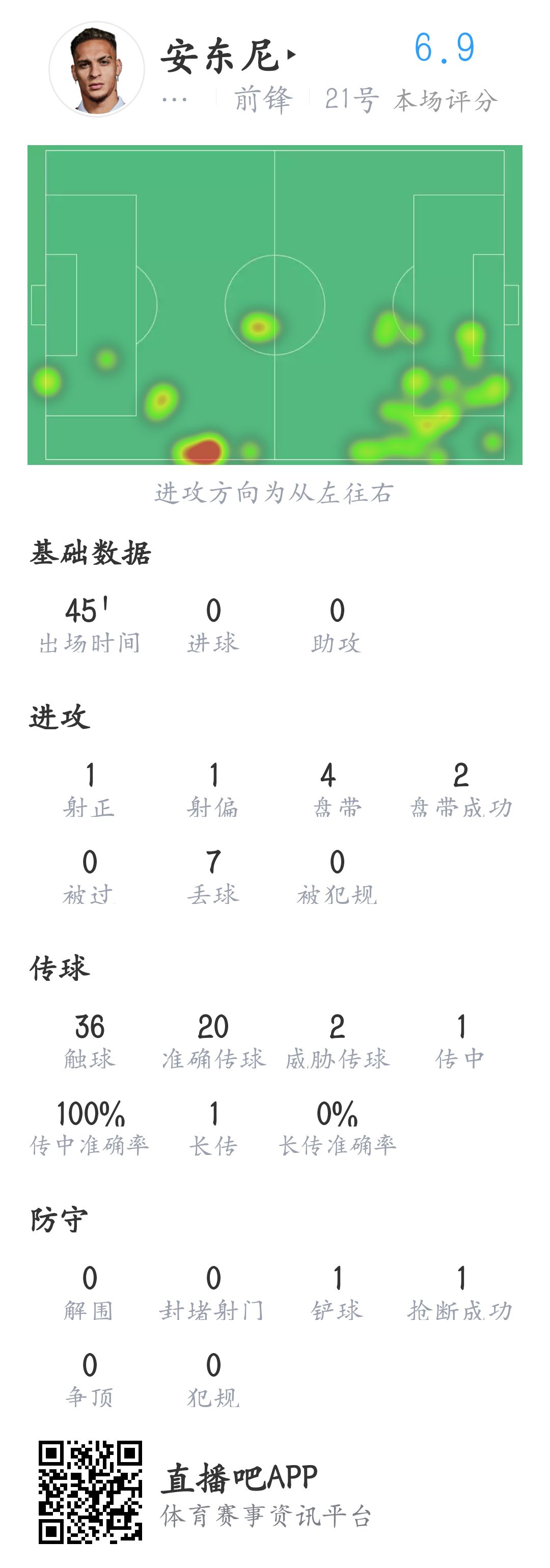 玩球网4月8日讯英超第30轮,曼联主场迎战埃弗顿,半场战罢,曼联1-0领先埃弗顿。安东尼半场数据如下↓安东尼短时间两失单刀:
