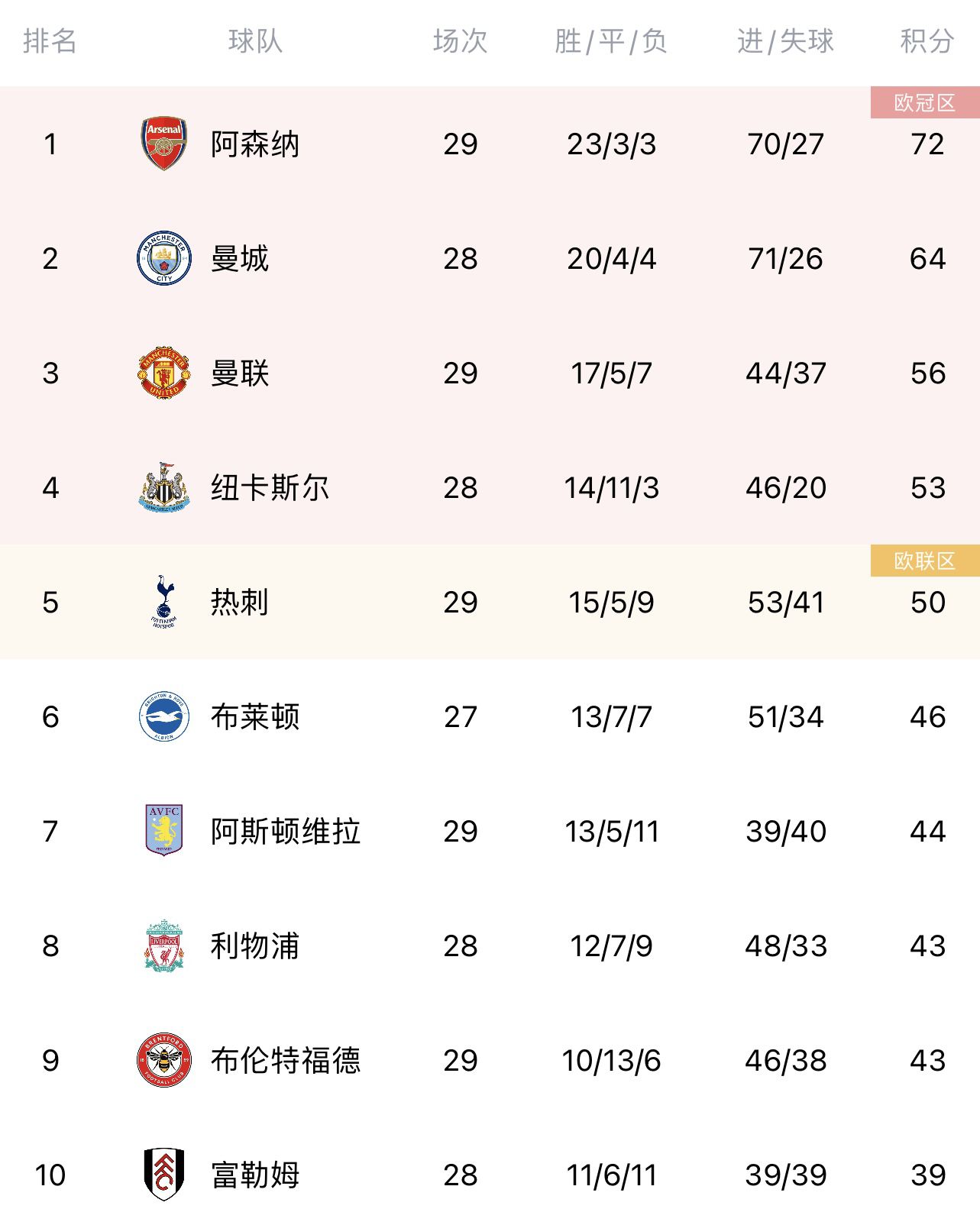 玩球网4月8日讯 英超第30轮早场,曼联主场2-0击败埃弗顿。最新积分榜如下↓