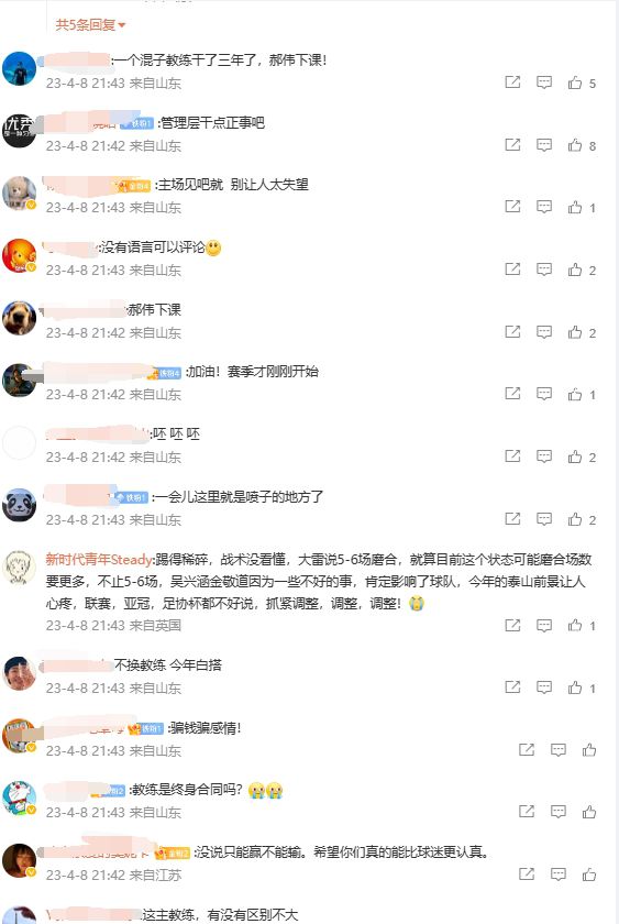 玩球网4月8日讯在山东泰山队0-2输掉了超级杯赛事后,一些泰山队球迷涌入了俱乐部官博,刷屏要求郝伟下课。另外,泰山队输球也冲上了微博热搜榜单。一些情绪激动的泰山队球迷,将失利的矛头直指泰山队主帅郝伟,