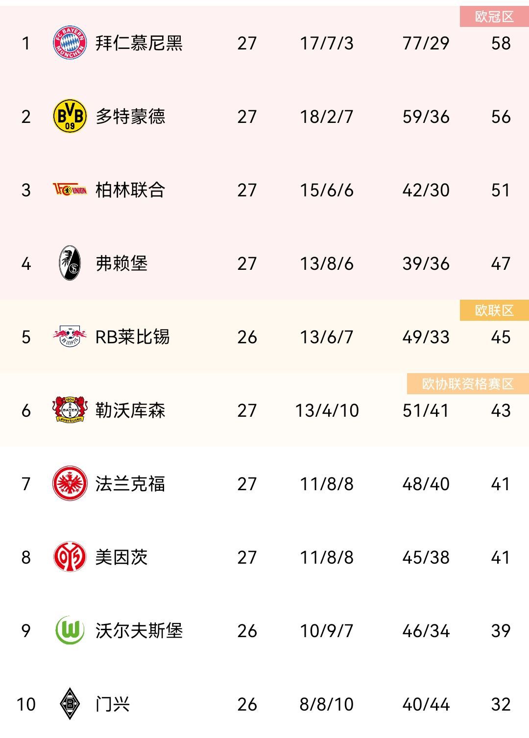 玩球网4月8日讯德甲第27轮先赛多场,其中拜仁1-0战胜弗赖堡,多特2-1战胜柏林联合。积分榜上,拜仁积58分,排名第一继续领先多特2分,多特积56分排第二。柏林联输球后积51分仍居第三,弗赖堡积47