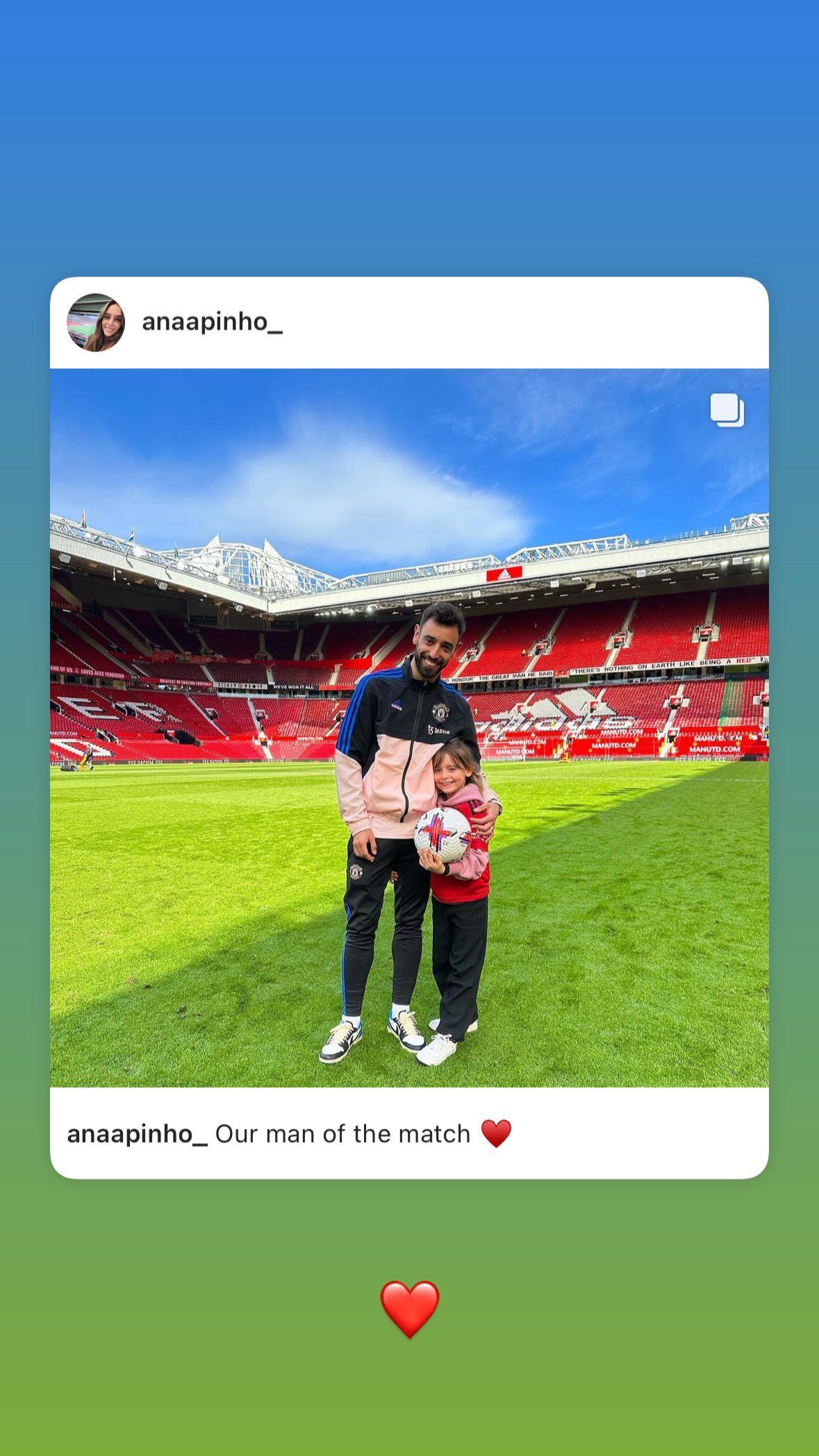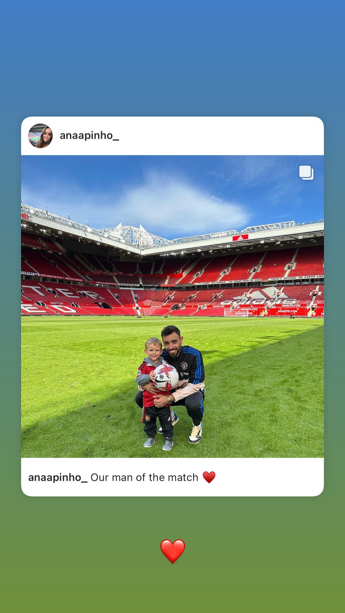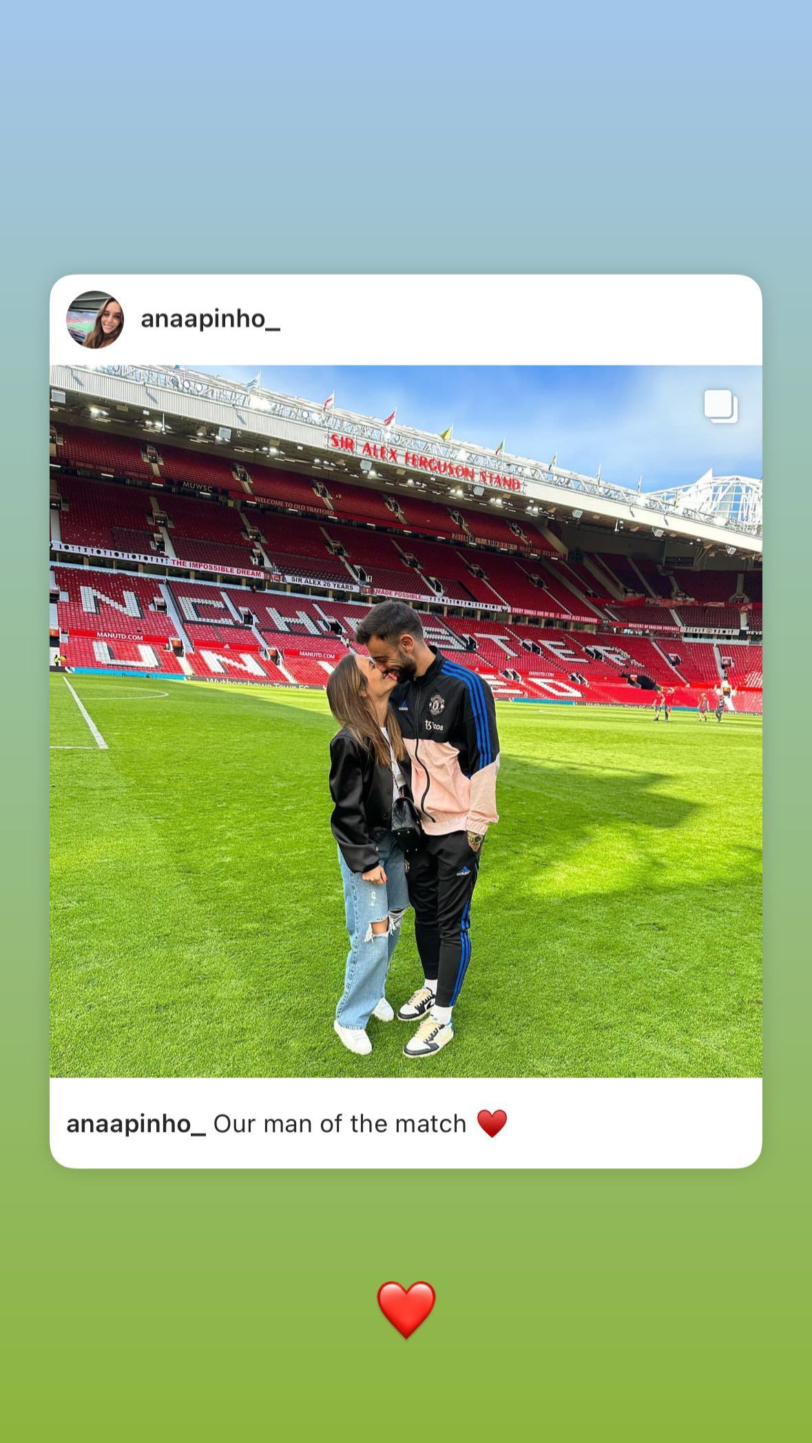 玩球网4月8日讯 B费更新社媒,转发了妻子晒出的与他接吻的照片。 曼联本轮2-0击败埃弗顿,B费本场比赛表现出色,创造出6次机会,他也被曼联球迷票选为队内最佳球员。 赛后,B费的妻子晒出她与B费在老特拉福德球场接吻以及B费与孩子的合照,并配文:“我们的全场最佳”,B费转发了这条社媒。 (Luca) |
