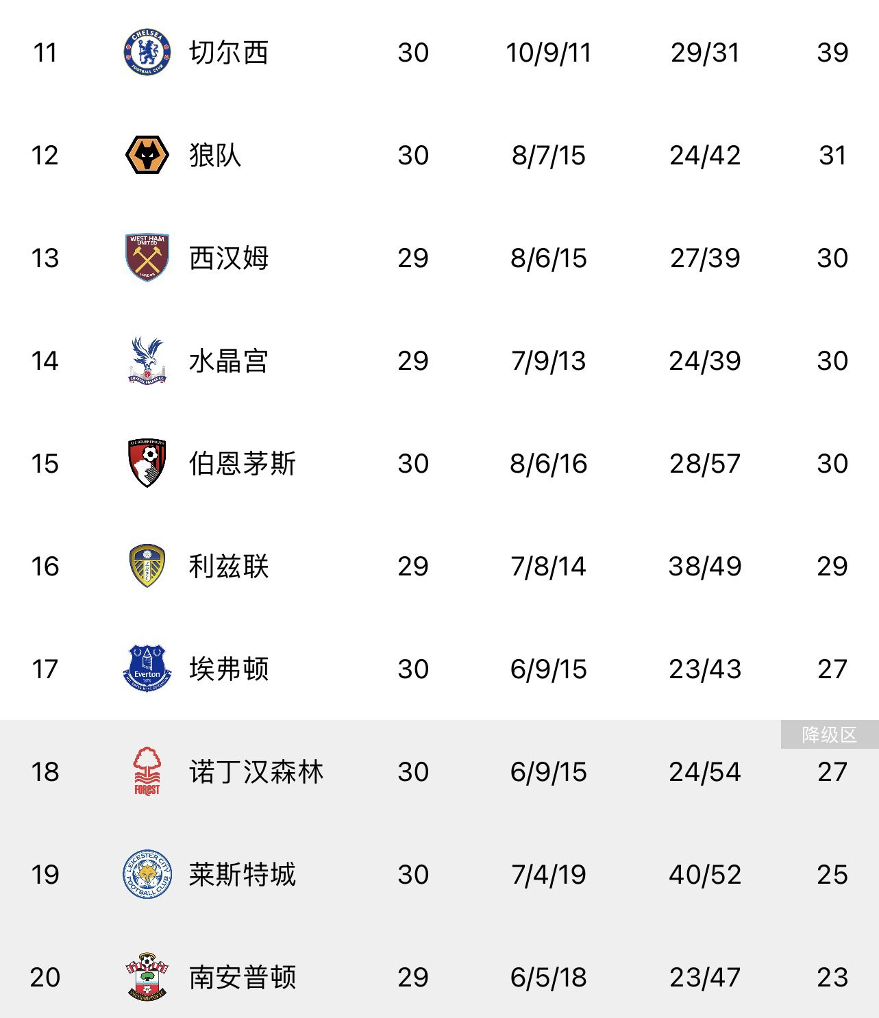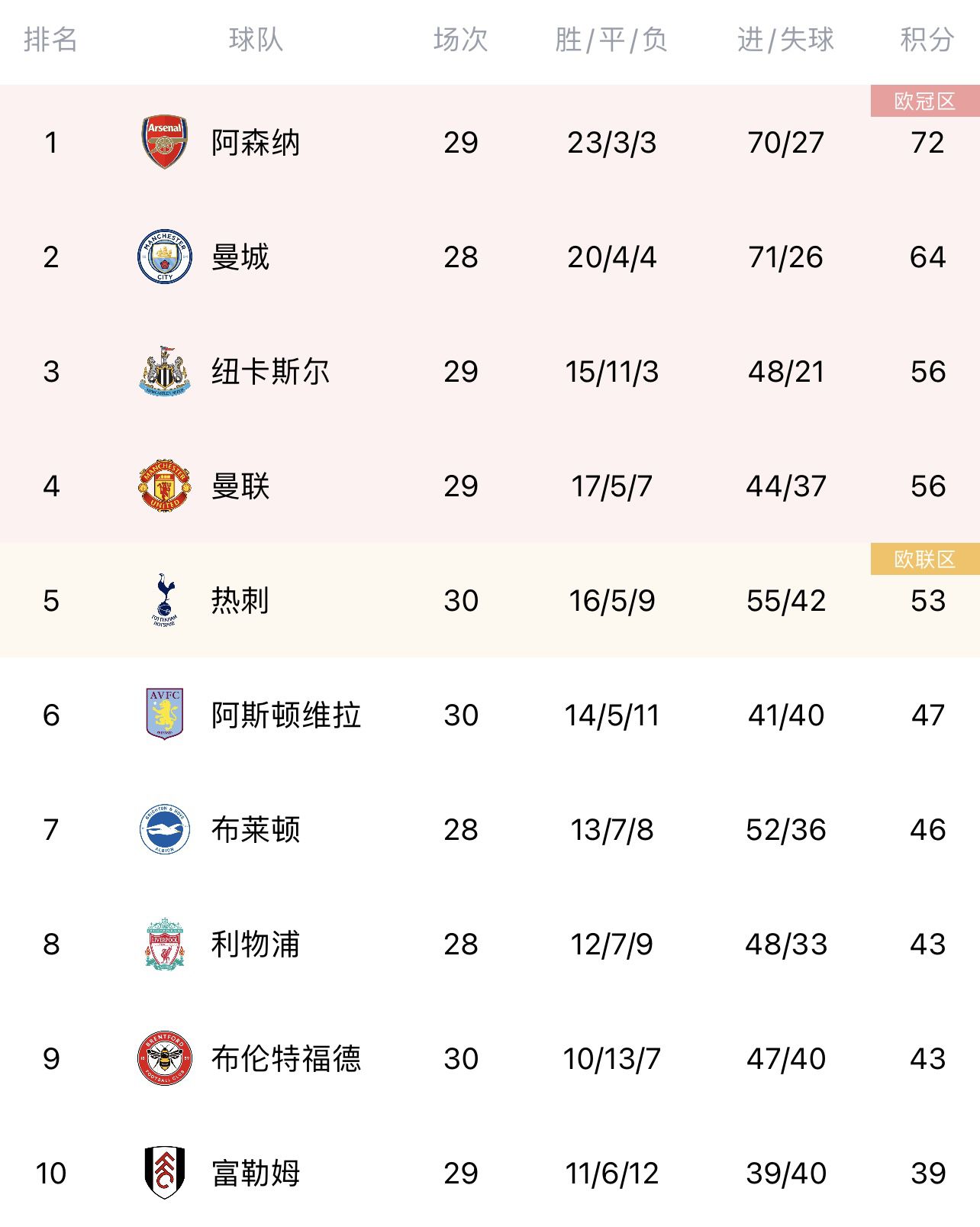 玩球网4月8日讯 英超第30轮多场战罢,其中切尔西0-1不敌狼队,热刺2-1击败布莱顿。最新积分榜如下。